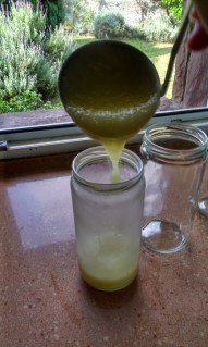 Paso 4. Después se vierten en unos tarros, calientes. A medida que va enfriando, espesa. Se deja enfriar, se tapa y se almacena para ir usándose. Se va utilizando a medida que sea necesario, y se puede añadir algo más de agua, si vemos que está demasiado espeso para nuestro gusto.