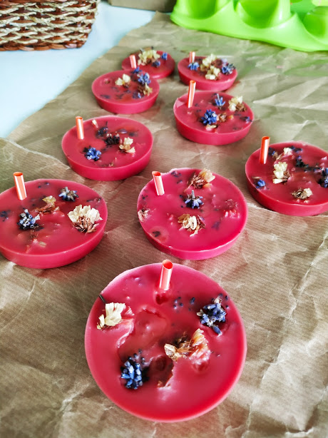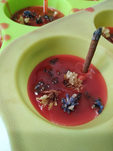 Se realiza de una forma sencilla, derritiendo trozos de velas que tengamos por ahí en desuso, o bien cera de abejas, a la que aromatizamos, coloreamos y añadimos flores secas para decorar.