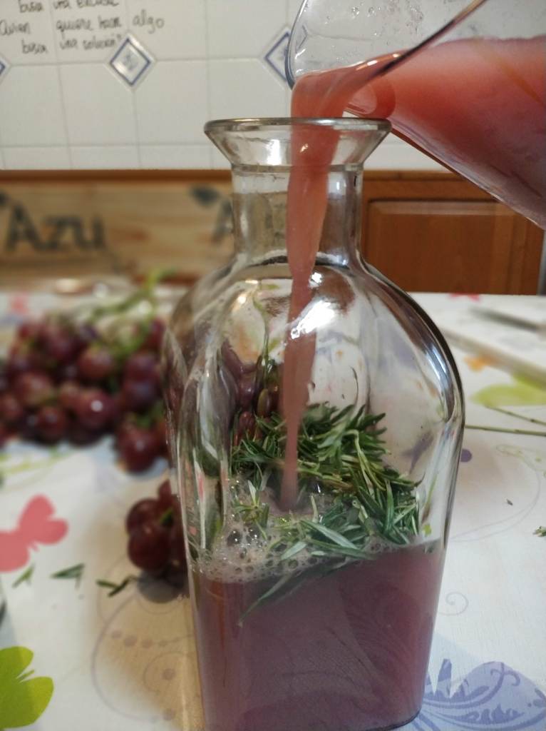 Se pone el zumo de uva en una jarra de boca ancha y añadimos las hojas de romero, que pelaremos separando las hojas de las ramas.