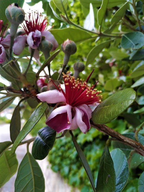Es una mirtácea, arbusto -también llamado guayabo del Brasil- perenne que ha sido considerado durante mucho tiempo como una planta ornamental debido a la belleza de hojas de un verde intenso, lisas y brillantes por el haz y blanquecinas por el envés, pero sobre todo por sus bellísimas flores, grandes, con colores violeta y blanco-rosado, con estambres rojos en verano, cuyos pétalos son comestibles.