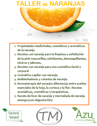 Os sorprenderá conocer todas las propiedades medicinales, cosméticas y terapéuticas, tanto para nuestra salud, como para nuestro bienestar, nuestra cosmética y la higiene familiar, incluso del hogar, que tienen las naranjas, y el naranjo en su conjunto, y por ese motivo, nos hemos animado a reunir muchas de ellas en un taller monográfico, y a elaborar con vosotros preparados sencillos, pero muy eficaces.