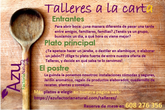 Envíanos un wasap al 608 276 356 o un mail a: factorianatural@gmail.com con tu nombre, apellidos, taller que os interesa y las palabras «TALLERES A LA CARTA» , y nos ponemos en contacto¡
