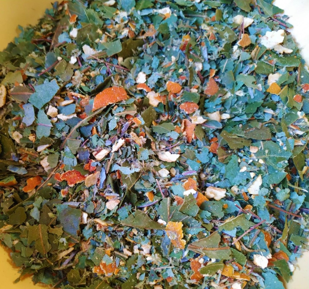 Ingredientes del popurrí: Cáscaras de mandarina, hojas de Hierbaluisa y Laurel, flores de Lavanda y Lavandín, y sumidades floridas de orégano y tomillo, con flores de siempreviva.