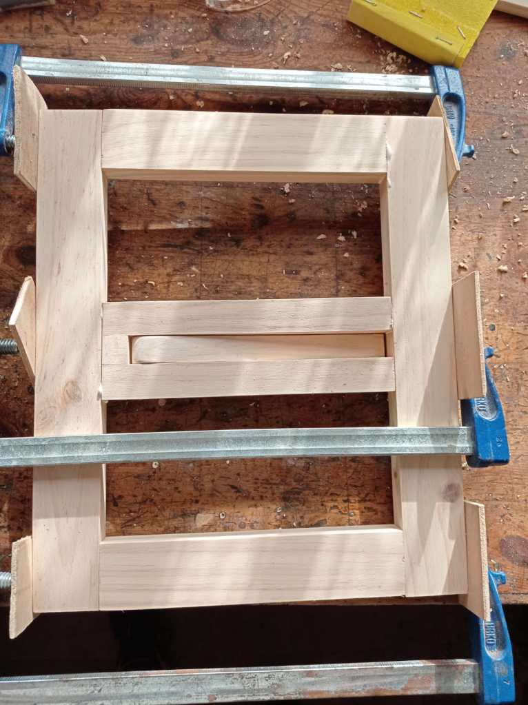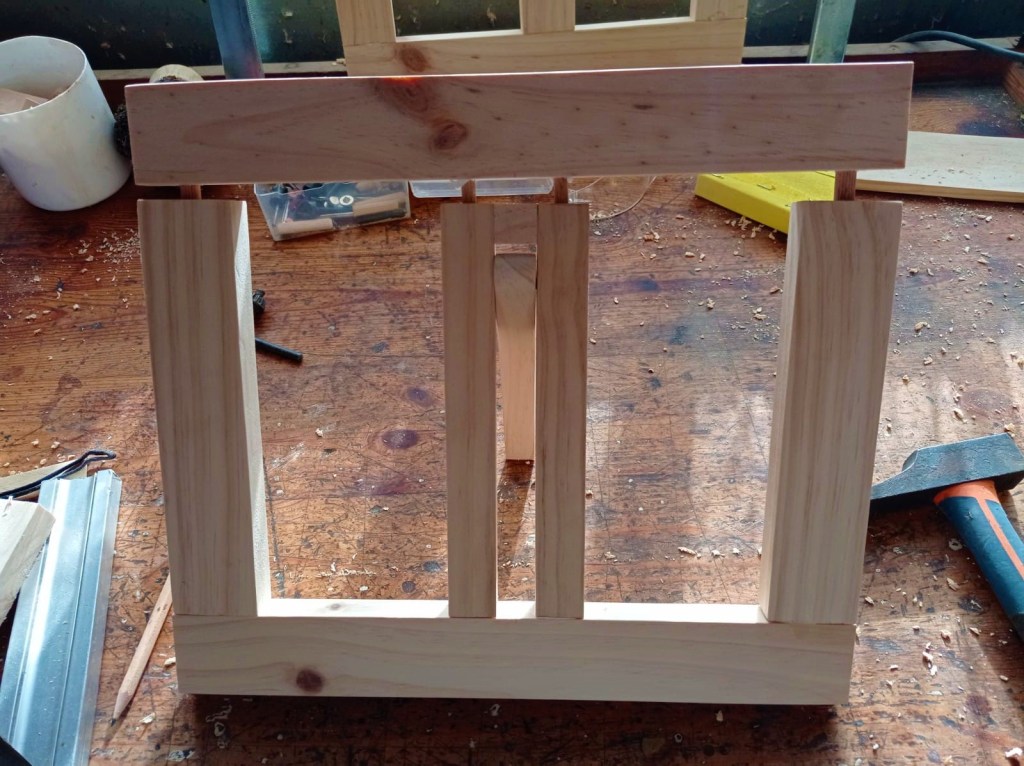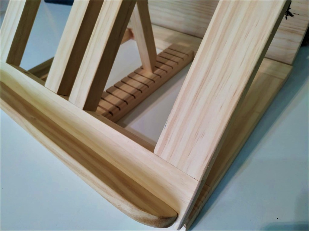 Diseño de planos y medidas de la pieza a fabricar-Selección de la madera-Preparación: corte y lijado de cada pieza-Montaje por piezas, uniones con tubillón de haya y pegado complementario con cola de carpintero-Fijación de piezas-Montaje final con la incorporación de las bisagras-Ajuste y sellado final-Tiempo de secado y fijación-Lijado final- Duración total: 4 horas y media.