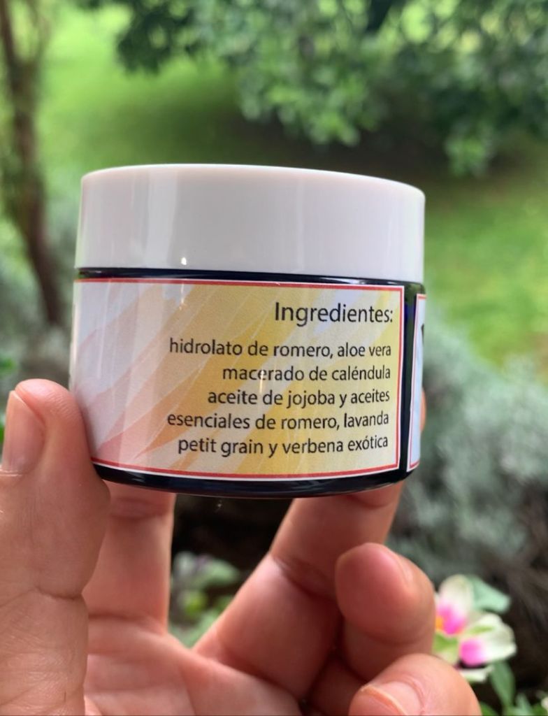 Ingredientes*: Hidrolato de romero y lavanda, Aloe vera, caléndula, aceite de jojoba y aceites esenciales de romero, lavanda, petit grain y verbena exótica. 100% ecológica. Envase de 50 cc.