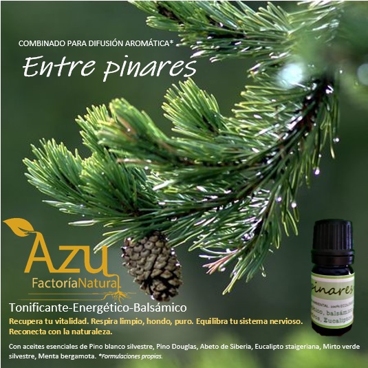 Nuestro COMBINADO AROMÁTICO ENTRE PINARES, para difusión ambiental en vuestros espacios del hogar o del trabajo, ayuda a PREVENIR resfriados, SUBIR las defensas, y EVITAR contagios, facilitando unas respiraciones PROFUNDAS Y BALSÁMICAS, que además te aportarán ENERGÍA en momentos de cansancio, depresión estacional, falta de concentración o fatiga nerviosa.