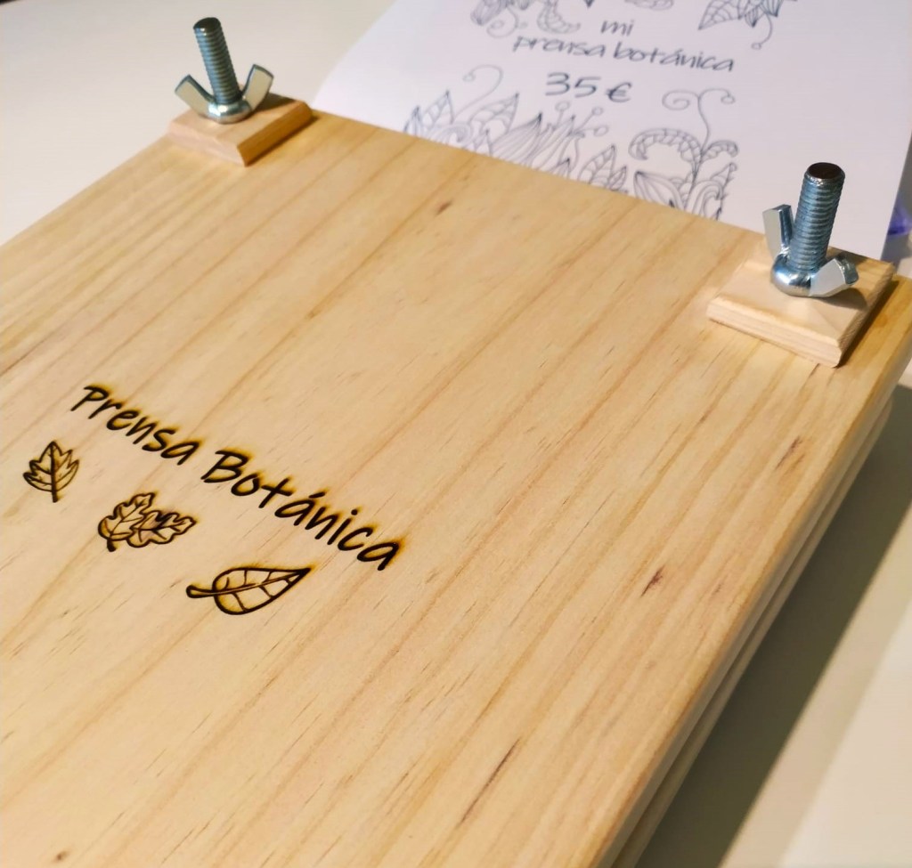 Nuestra prensa tiene dos gruesas tapas de madera de pino de 31 x 22 x 5 cm. con un grosor de 16 mm. con 4 tornillos con palomillas de cierre de forma que aprieta de una manera segura, cómoda y uniforme por todos los lados. En su interior se acompaña con 3 separadores de chapa okume de 5 milímetros. Y ahora te viene grabada a laser¡¡¡
